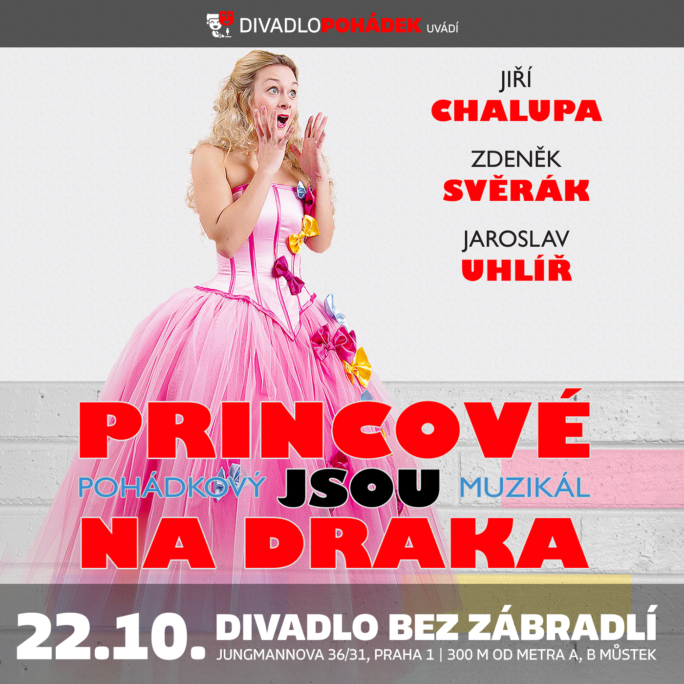 Pohádkový muzikál Jiřího Chalupy Princové jsou na draka s písničkami Zdeňka Svěráka a Jaroslava Uhlíře uvedeme v neděli 22. října 2023 od 11.00 hod. na naší stálé pražské scéně v Divadle Bez zábradlí.